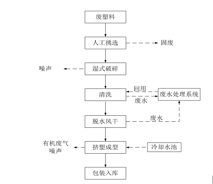 由于回收的废旧塑料大部分粘附尘土等,为了避免杂质影响再生塑料质量,将破碎的废塑料用水清洗去除废旧塑料表面杂质(塑料采用清水清洗,清洗工序无需添加清洗剂)。由于废旧塑料表面主要为尘土,项目清洗废水流入污水处理系统经其处理后回用,定期外排。